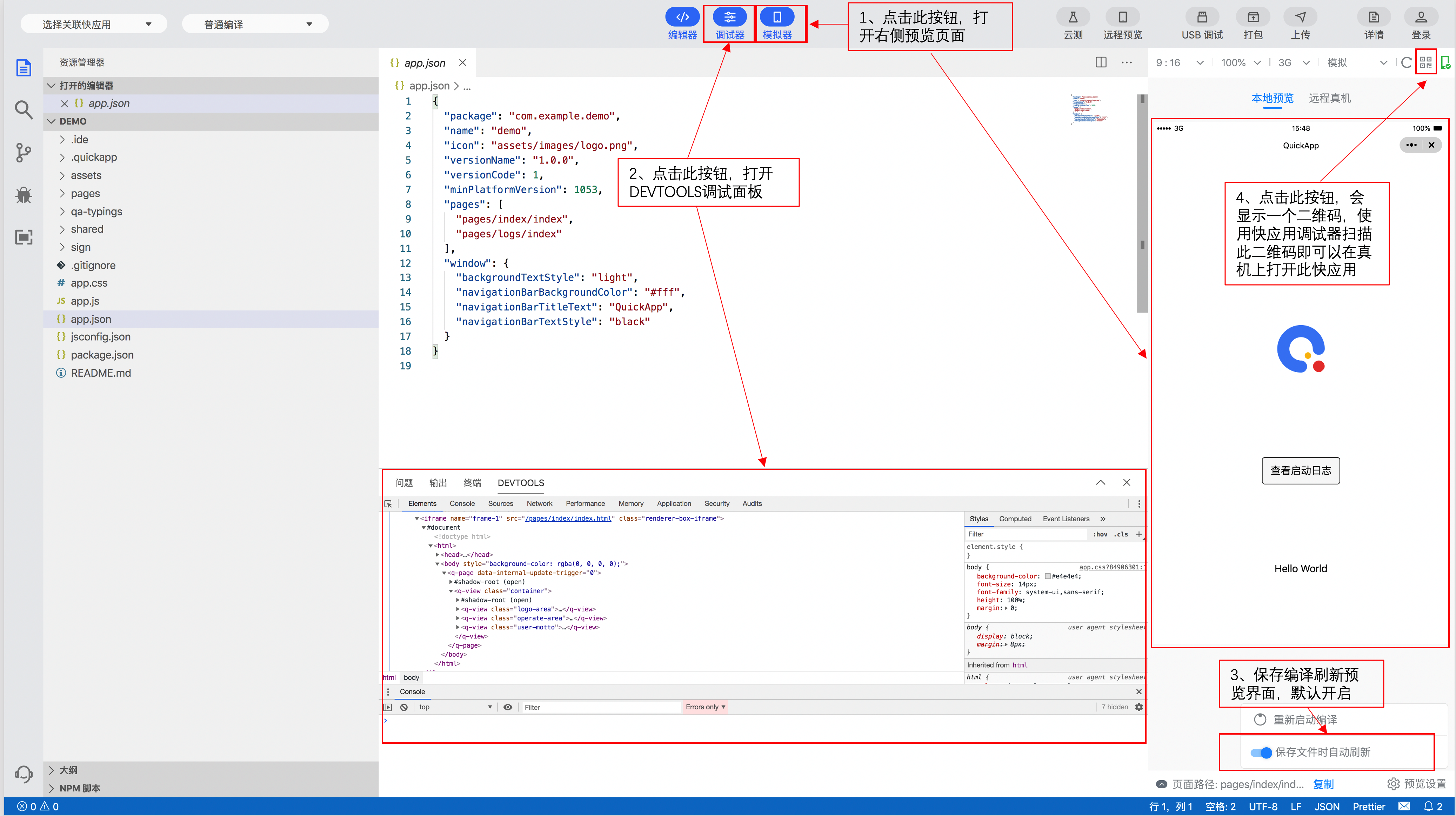 新建完一个工程之后,可以利用 IDE 进行开发、预览和调试。编写代码时,保存文件 IDE 会重新编译项目并刷新页面。